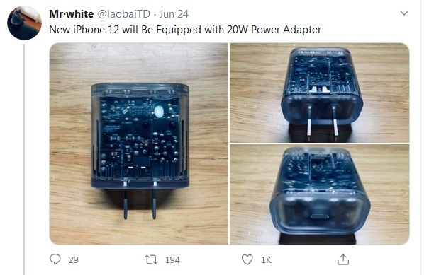 Với thế hệ iPhone 12 dự kiến ra mắt cuối năm, nhiều khả năng Apple sẽ tặng kèm bộ chuyển đổi nguồn sạc nhanh công suất 20W. Đây là thông tin được rò rỉ ra bởi tài khoản Twitter “Mr white”.