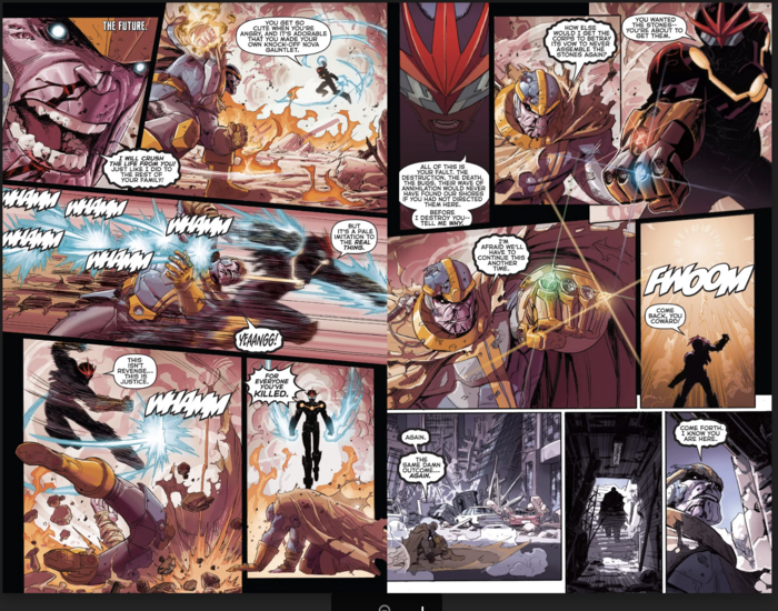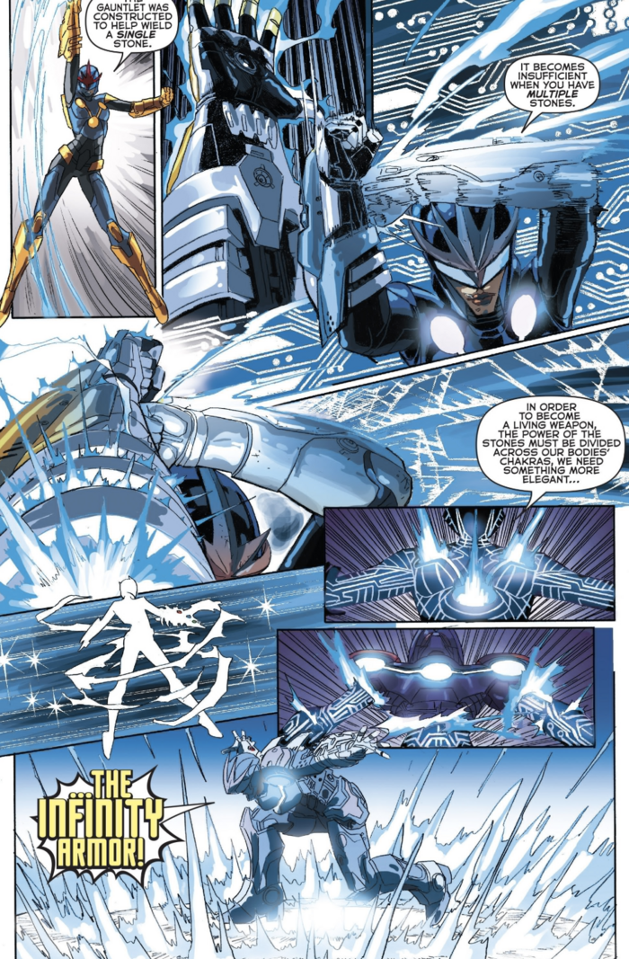 Trong tương lai của thực tại này, Thanos – với hai Viên đá Vô Cực đă liên tục thất bại và bị đánh cho thân tàn ma dại dưới tay một chiến binh Nova sử dụng bộ giáp Infinity Armor, đến mức phải liên tục dùng sức mạnh của Viên đá Thời Gian để “reset”. Chiến binh Nova đó chính là Anwen, và đoán xem, trên tay cô là chiếc găng bản sao (chỉ được thiết kế nhằm sử dụng một viên đá trong 1 thời điểm) và chỉ có đúng một Viên đá Vô Cực.