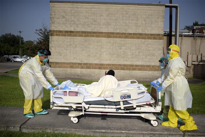 Nhân viên y tế chuyển bệnh nhân mắc COVID-19 tại một bệnh viện ở bang Texas, Mỹ ngày 2/7/2020. Ảnh: AFP/TTXVN
