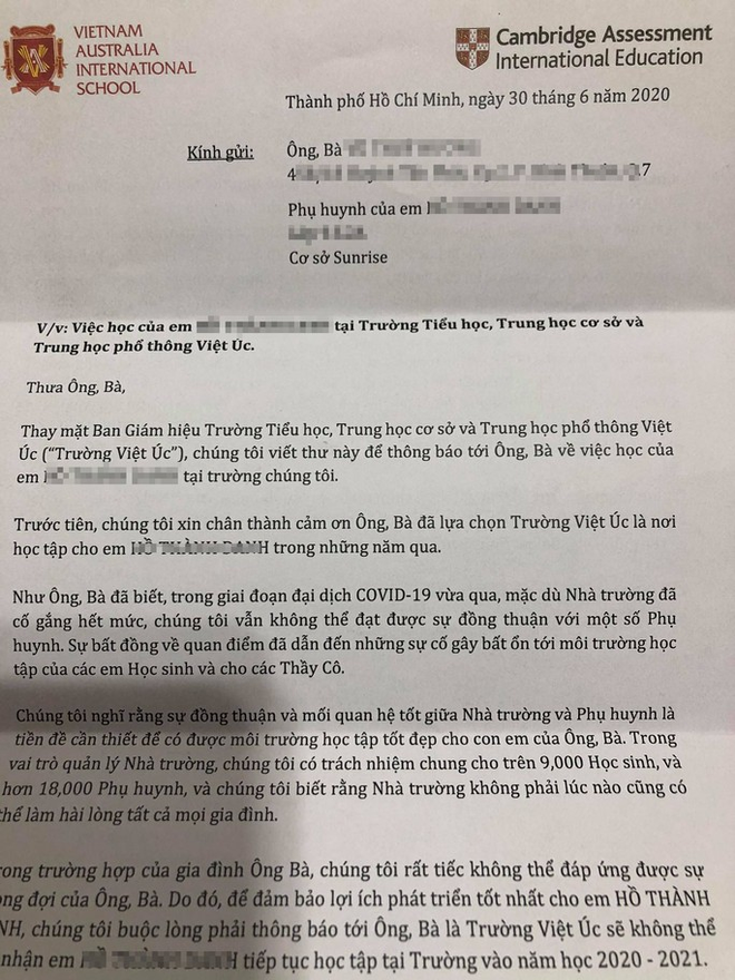 Nhằm duy trì trật tự và tiếp tục phát triển một môi trường học tập đáng mơ ước cho hơn 9.000 học sinh VAS như trước đây, buộc phải gửi thư thông báo đến phụ huynh về việc không thể tiếp tục tiếp nhận con em của họ trong năm học 2020 – 2021.
