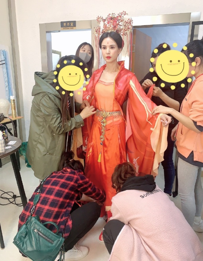 Đi kèm với những bức ảnh này, nữ diễn viên chia sẻ: "Chưa bao giờ chịu để cho người khác mang giày cho mình. Tuy nhiên hôm nay phải hóa trang để quay phim, thời gian gấp rút, tình huống khẩn cấp nên tôi đành phải thỏa hiệp. Làm tân nương cổ trang không hề dễ chút nào. Mọi người hài lòng với tạo hình này chứ?".