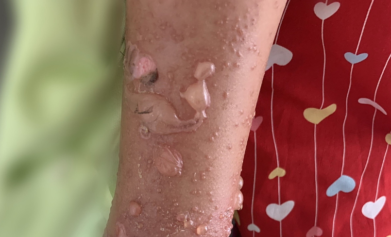 Bé gái 8 tuổi khám tại Bệnh viện Da liễu TP HCM vì cánh tay phải nổi nhiều bóng nước, đau rát.
