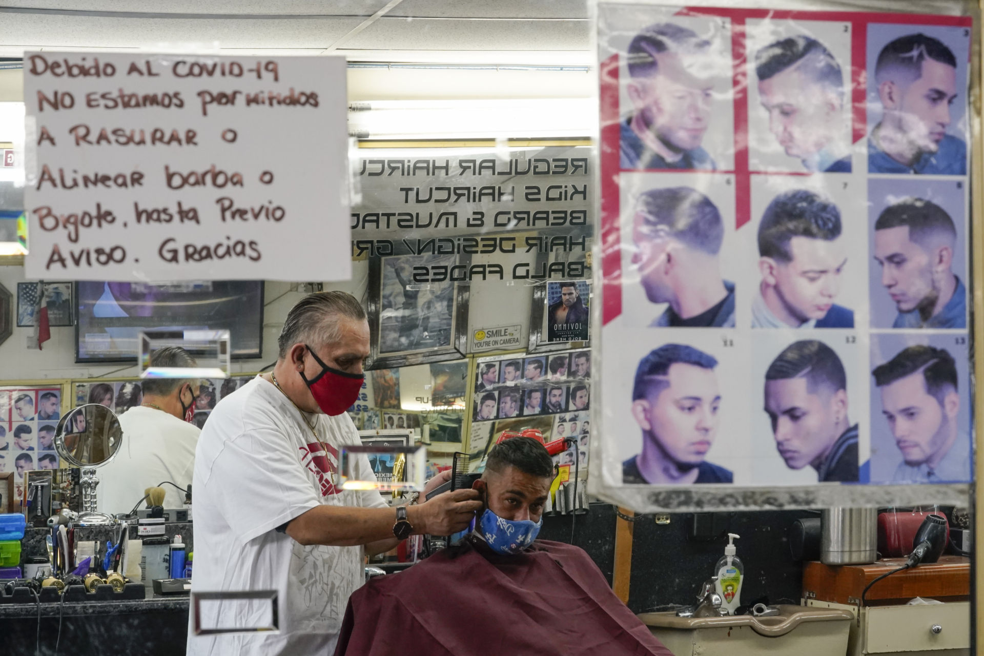 Tiệm tóc George's ở San Pedro, California, vẫn mở cửa hôm Thứ Ba, 14 Tháng Bảy, một ngày sau khi tiểu bang ra lệnh cấm nhiều doanh nghiệp hoạt động trong nhà mở cửa. (Hình minh họa: AP Photo/Ashley Landis)