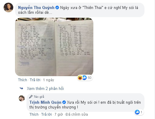 Thu Quỳnh đăng tải lại bức ảnh này bên dưới bài đăng của ca sĩ Minh Quân kèm dòng chú thích: "Ngày xưa ở "Thiên Thai", em cứ nghĩ My Sói là oách lắm rồi! Ai dè!". Nam ca sĩ đáp lời: "Xưa rồi My Sói ơi! Em đã bị truất ngôi trên thị trường chuyển nhượng" khiến dân mạng phấn khích. Nhiều cư dân mạng cho rằng, ca sĩ Minh Quân nhắc khéo số tiền 3.000 USD của My Sói chẳng thấm vào đâu so với mức giá của các cô gái trong đường dây bán dâm của "tú ông" Lục Triều Vỹ.