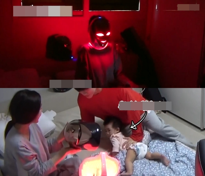 Ham So Won đeo mặt nạ đèn led nhìn giống như siêu nhân để dưỡng da.
