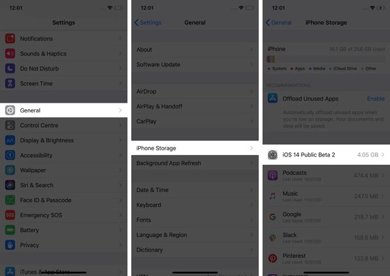 Tương tự như trên, bạn cũng cần vào Settings (cài đặt) - General (cài đặt chung) - iPhone Storage (dung lượng iPhone), kéo xuống bên dưới và tìm đến tệp cập nhật, chạm vào nó và nhấn Delete update (xóa cập nhật), xác nhận lại một lần nữa khi được yêu cầu.