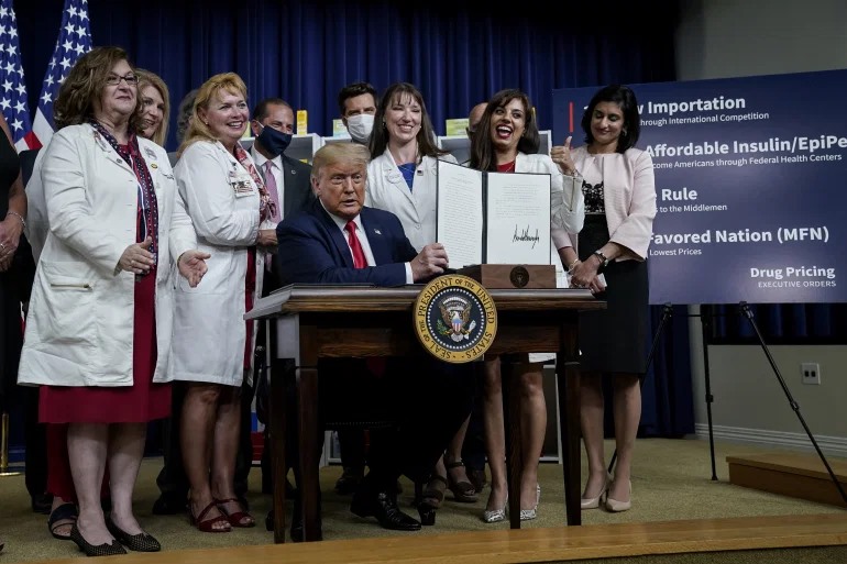 Các sắc lệnh hành pháp này, được thiết kế để đưa giá thuốc của Hoa Kỳ giảm xuống ít nhất ngang bằng với giá ở nước ngoài. Trump cho biết người Mỹ thường trả nhiều hơn 80% cho thuốc theo toa, so với Đức, Canada và các quốc gia khác cho một số loại thuốc đắt nhất.