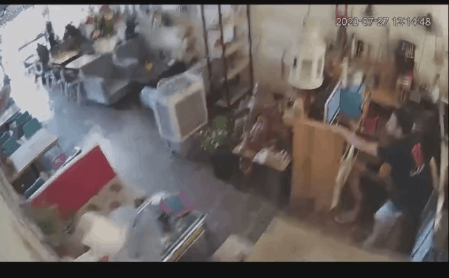 Sự cố bất ngờ khiến nhân viên trong quán tháo chạy ra ngoài. Một chàng trai áo đen chui ngay xuống gầm bàn. Lúc sau, khi thấy bạn gọi, cậu này cũng chạy ra ngoài.