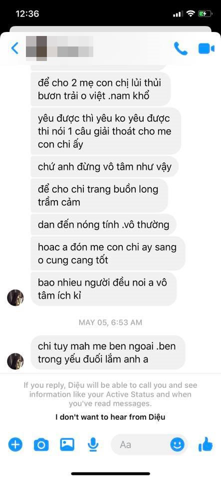Nội dung tin nhắn như sau: "Em cũng chịu anh đấy anh! Anh ở bên Mỹ cũng bao nhiêu năm rồi, không về mà ở cùng hai mẹ con chị Trang. Tiền đối với anh quan trọng thế sao? Để cho hai mẹ con chị lủi thủi bươn trải ở Việt Nam, khổ! Yêu được thì yêu, không yêu được thì nói một câu giải thoát cho mẹ con chị ấy chứ anh đừng vô tâm như vậy để chị Trang buồn lòng, trầm cảm dẫn đến nóng tính. Hoặc anh đón mẹ con chị ấy sang ở cùng càng tốt. Bao nhiêu người đều nói anh vô tâm, ích kỷ. Chị tuy mạnh mẽ bên ngoài, bên trong yếu đuối lắm anh à".