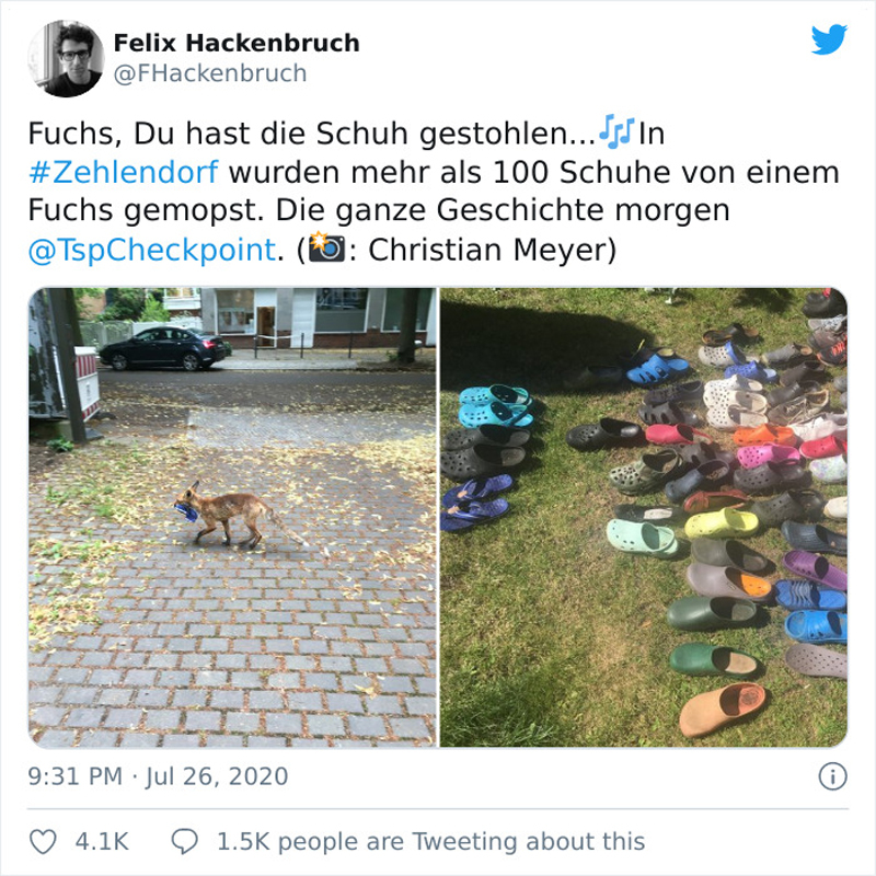 Một con cáo ở Zehlendorf, ngoại ô Berlin (Đức) đã trộm hơn 100 đôi dép từ nhà người dân trong khu vực. Cư dân tên Christian Meyer bắt đầu nhận ra đôi giày của mình đã biến mất, anh đăng lên bảng thông báo cộng đồng để điều tra. Và rồi phát hiện ra mình không phải là người duy nhất bị mất giày.