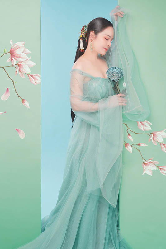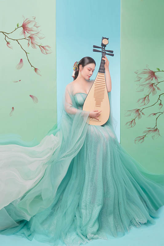 Bà mẹ một con tạo dáng e ấp bên nhành hoa xanh, cây đàn... khoe khéo thân hình quyến rũ cùng thần thái chuẩn mỹ nhân phim cổ trang.