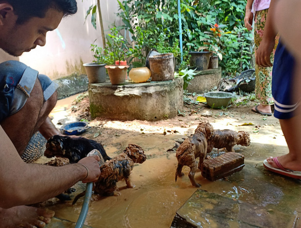 Surachet tắm rửa sạch sẽ cho 5 chú cún.