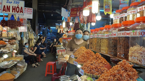 Khác hẳn với cảnh tấp nập bên ngoài, đi sâu vào phía trong chợ là các quầy đồ khô, tạp hóa, quần áo, giàu dép... vắng bóng khách, chủ yếu là tiểu thương đeo khẩu trang ngồi nói chuyện với nhau hoặc tranh thủ ăn sáng. Đi hết một vòng phía trong chợ, tôi chỉ gặp chừng chục khách đi mua cá khô và vài món đồ linh tinh.