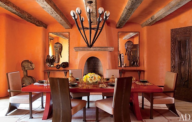 Phòng ăn độc đáo, sặc sỡ với tông màu cam chủ đạo. Điểm nhấn của căn phòng là những vật trang trí cầu kỳ được sắp xếp tinh tế.