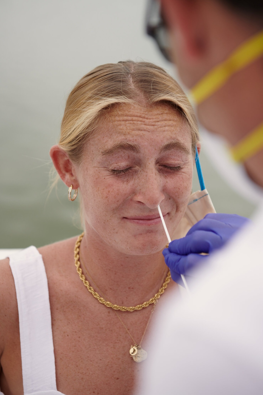 Một người được lấy dịch mũi để xét nghiệm nhanh virus corona tại Montauk, New York. Ảnh: New York Times.