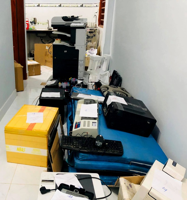 Nhiều dụng cụ máy móc dùng để in ấn, sản xuất, con dấu các loại và nhiều phôi các giấy tờ giả đã bị niêm phong. Tại nhà riêng của các đối tượng, tổ công tác của Bộ Công an thu giữ thêm nhiều tài liệu liên quan.