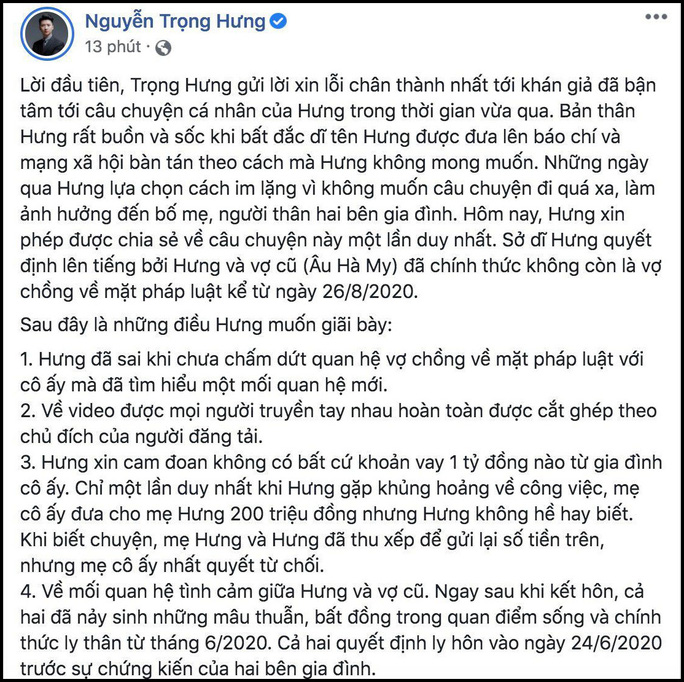 Theo đó, Trọng Hưng lần lượt giải thích từng chi tiết trong vụ ồn ào thời gian vừa qua. "Bản thân Hưng rất buồn và sốc khi bất đắc dĩ tên Hưng được đưa lên báo chí và mạng xã hội bàn tán theo cách mà Hưng không mong muốn. Những ngày qua, Hưng lựa chọn cách im lặng vì không muốn câu chuyện đi quá xa, làm ảnh hưởng đến bố mẹ, người thân hai bên gia đình. Hôm nay, Hưng xin phép được chia sẻ về câu chuyện này một lần duy nhất. Sở dĩ Hưng quyết định lên tiếng bởi Hưng và vợ cũ (Âu Hà My) đã chính thức không còn là vợ chồng về mặt pháp luật kể từ ngày 26-8-2020" - diễn viên Trọng Hưng lý giải việc bản thân im lặng sau khi bị Âu Hà My tố ngoại tình cùng clip làm bằng chứng ồn ào những ngày qua.