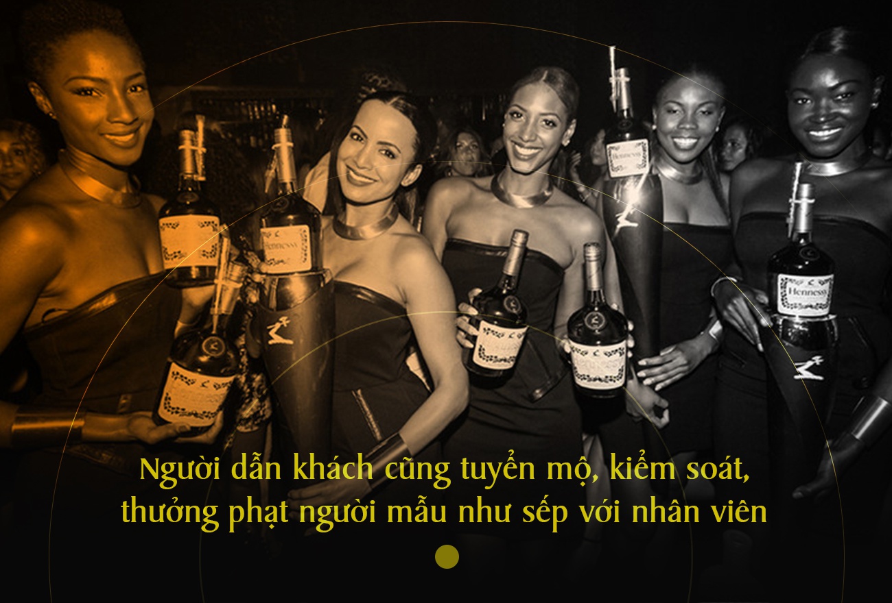 Nhưng thực tế là họ có kiểm soát người mẫu. Người dẫn khách cũng tuyển mộ, kiểm soát, thưởng phạt người mẫu như sếp với nhân viên. Các cô gái về lý thuyết có thể tự do đến và đi tùy ý muốn, nhưng sẽ bị nói cho cảm thấy xấu hổ nếu bỏ một buổi tiệc tùng giữa chừng.