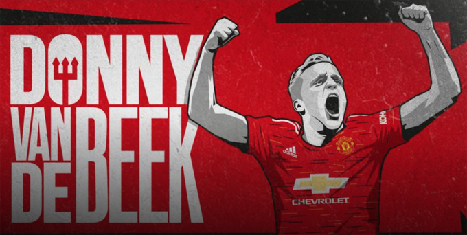 Poster của Man Utd chào mừng Van de Beek gia nhập. Tiền vệ người Hà Lan có phí chuyển nhượng 48 triệu USD, ký hợp đồng năm năm với Man Utd và sẽ hội quân từ tuần tới, sau đợt tập trung ĐQTG.