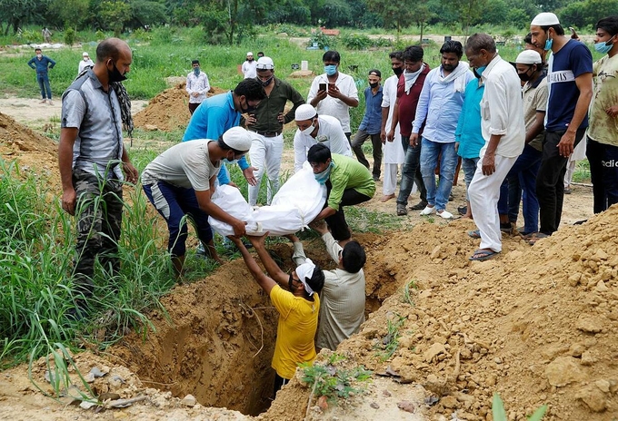Người thân chôn cất một phụ nữ chết vì Covid-19 ở nghĩa trang tại New Delhi, Ấn Độ, hôm 17/8. Ảnh: Reuters.