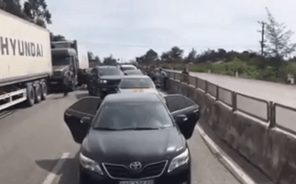Trong lề phải của đường, 2 chiếc container đậu sát nhau, trước đầu là 1 chiếc xe tải nhỏ nằm ngang chắn hết làn đường.