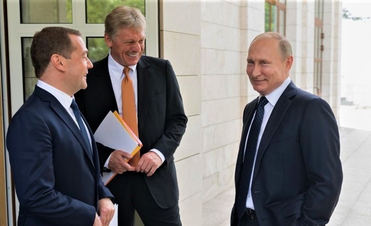 Tổng thống Putin (phải), cựu Tổng thống Medvedev (trái) và Thư ký báo chí Peskov; Nguồn: politryk.ru