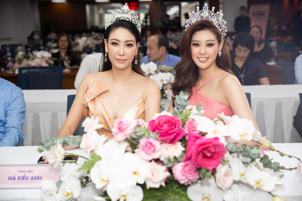 Khánh Vân diện đầm hồng cổ yếm cách điệu hội ngộ Hoa hậu Hà Kiều Anh. Hoa hậu Khánh Vân rạng ngời trong đầm hồng, đội vương miện Brave Heart khi xuất hiện tại sự kiện làm đẹp với vai trò Đại sứ.