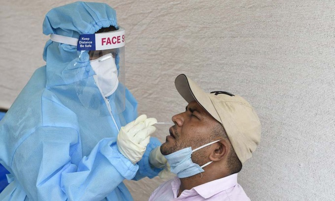 Nhân viên y tế lấy mẫu xét nghiệm nCoV cho người dân tại thành phố Ahmedabad, Ấn Độ, hôm 14/9. Ảnh: AFP.