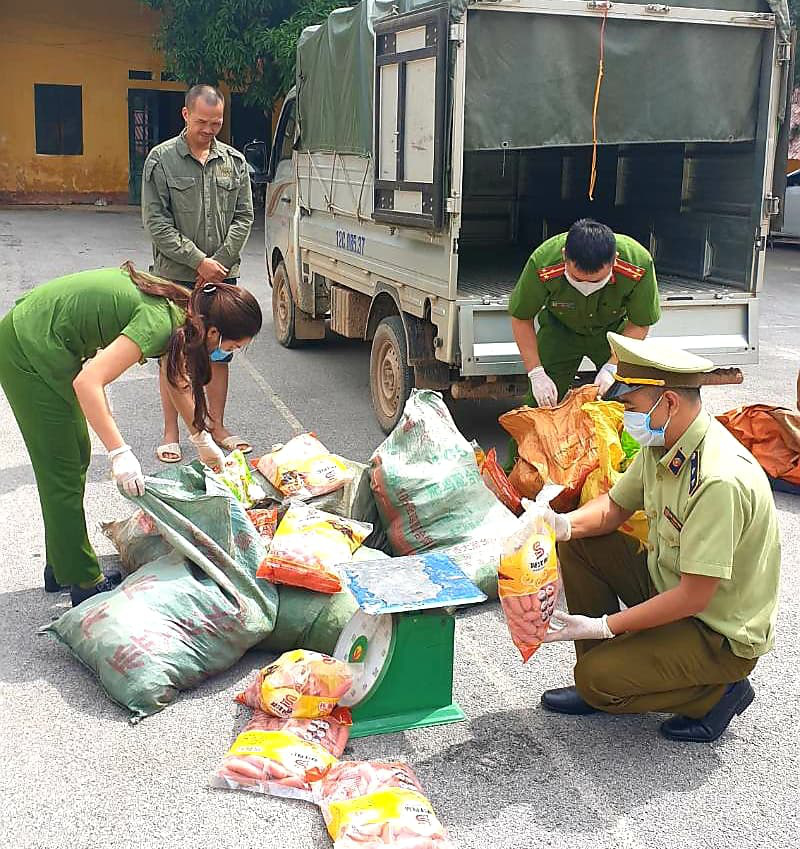 Đoàn kiểm tra tiến hành kiểm tra thực tế hàng hóa vận chuyển trên xe ô tô gồm 1 loại hàng hóa là xúc xích, sản xuất ngoài Việt Nam đang trong quá trình biến đổi màu sắc, vỏ ngoài ướt có hiện tượng nấm mốc. Số lượng 5.000 cái, trị giá lô hàng ước tính gần 20 triệu đồng.