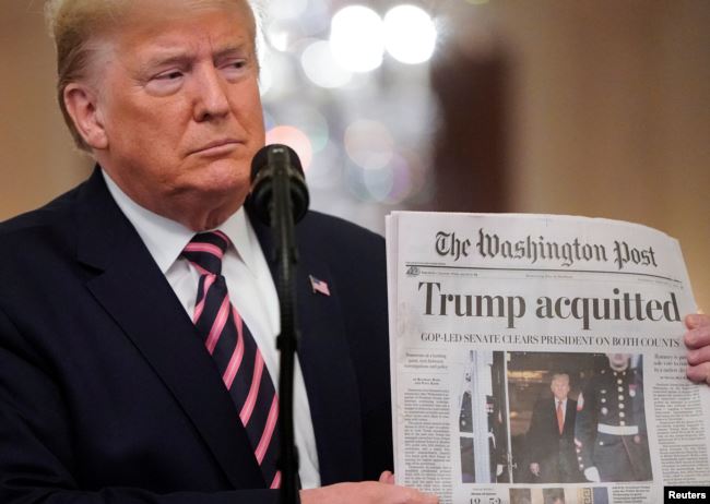 Tổng thống Trump giơ tờ báo The Washington Post với bản tin trang nhất về việc ông được xử trắng án trong phiên xét xử luận tội ở Thượng viện, khi ông phát biểu về sự kiện này trong Phòng Đông của Nhà Trắng ở Washington, ngày 6 tháng 2, 2020.