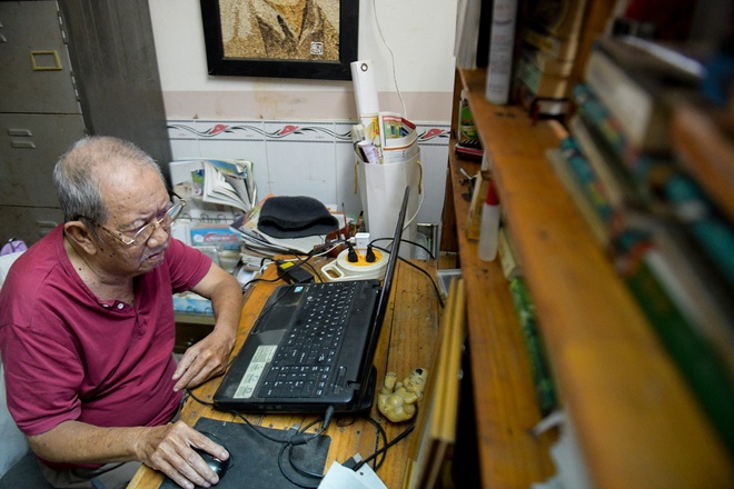 Ở tuổi 75, nghệ sĩ Mạc Can vẫn viết sách, báo. Ảnh: Quỳnh Trang.