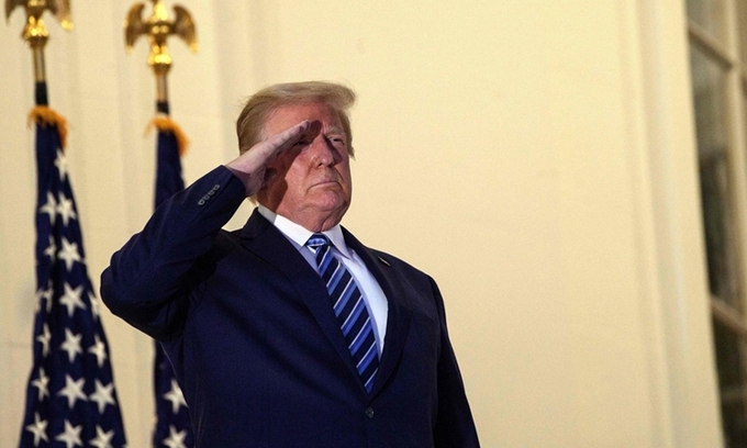 Sau khi rời Trung tâm Quân y Quốc gia Walter Reed để trở về Nhà Trắng, Tổng thống Trump đă tự đi bộ lên tầng hai, bước ra ban công, bỏ khẩu trang vào túi và giơ tay chào.