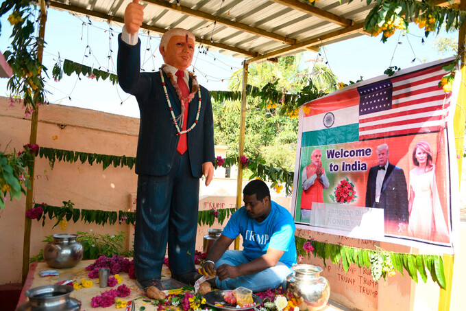 Bussa Krishna Raju và góc thờ Trump tại nhà ở bang Telangana hồi tháng hai. Ảnh: AFP.