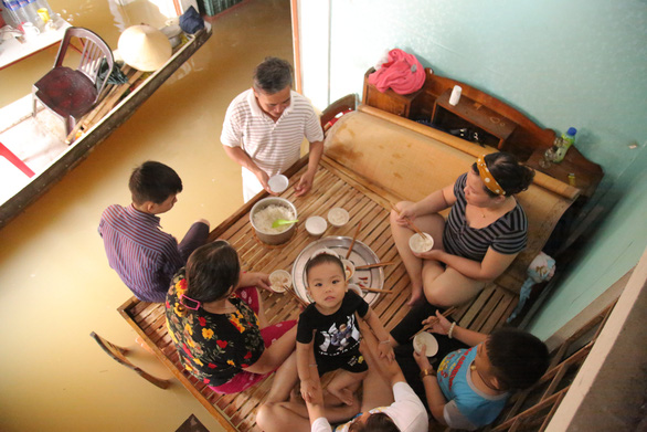 Bà Lý Thị Lệ Thảo (50 tuổi), vợ ông Trà, cuốn chiếc chiếu lên đầu giường che mớ gối đang rịn nước để có chỗ dọn mâm cơm. Trải qua 7 ngày lũ nhưng đã 4 ngày nay nhà hết gạo, thùng mì tôm cứu trợ là nguồn lương thực chính của gia đình. Người lớn còn gắng chịu, chỉ tội đứa con út bà Thảo mới lên lớp 3 và đứa cháu trai hơn 2 tuổi thèm cơm.