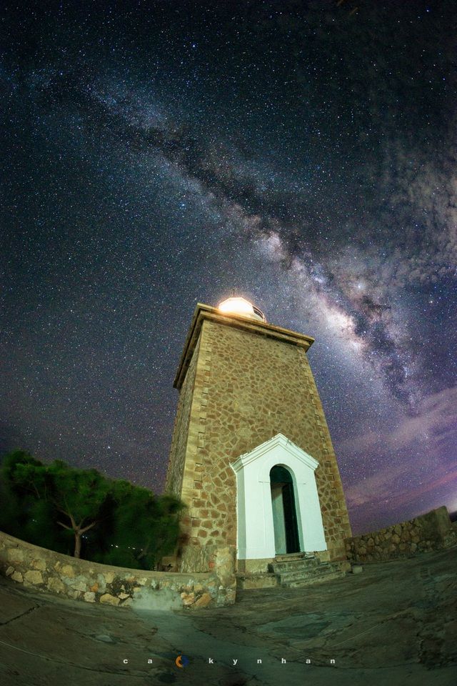 Để 'săn' được những bức ảnh dải ngân hà độc đáo, anh Nhân phải chuẩn bị 'đồ nghề' rất kì công. 'Phải chọn thời điểm phù hợp và một tầm nhìn thoáng, không bị ảnh hưởng bởi ánh sáng đèn điện hay ánh trăng thì mới có thể chụp dải ngân hà rõ nét nhất. Thường sẽ chụp tiền cảnh trước khi trời chưa quá tối, dùng kỹ thuật phơi sáng lâu hoặc một số mẹo như quét đèn pin, đốt thêm tí lửa,... để giúp cho tiền cảnh sáng hơn. Chụp tiền cảnh xong thì mình vẫn dựng chân máy cố định như vậy và chờ thời điểm dải ngân hà xuất hiện rõ nhất trên trời là bắt đầu chụp', anh Nhân chia sẻ. (Ảnh: Cao Kỳ Nhân)