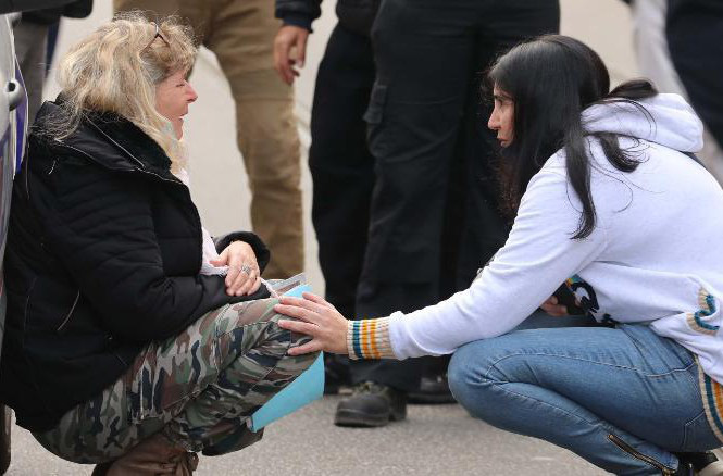 Một phụ nữ nức nở bên xe cảnh sát tại hiện trường vụ tấn công (Ảnh: CNN)
