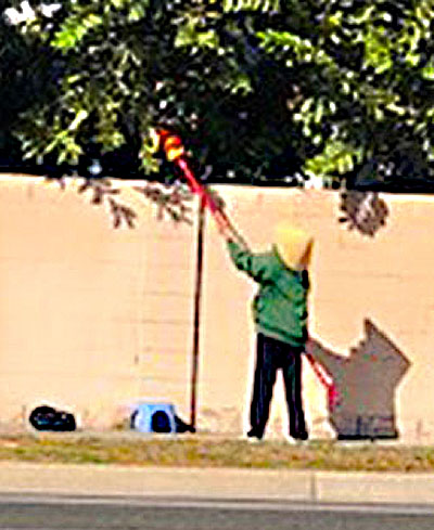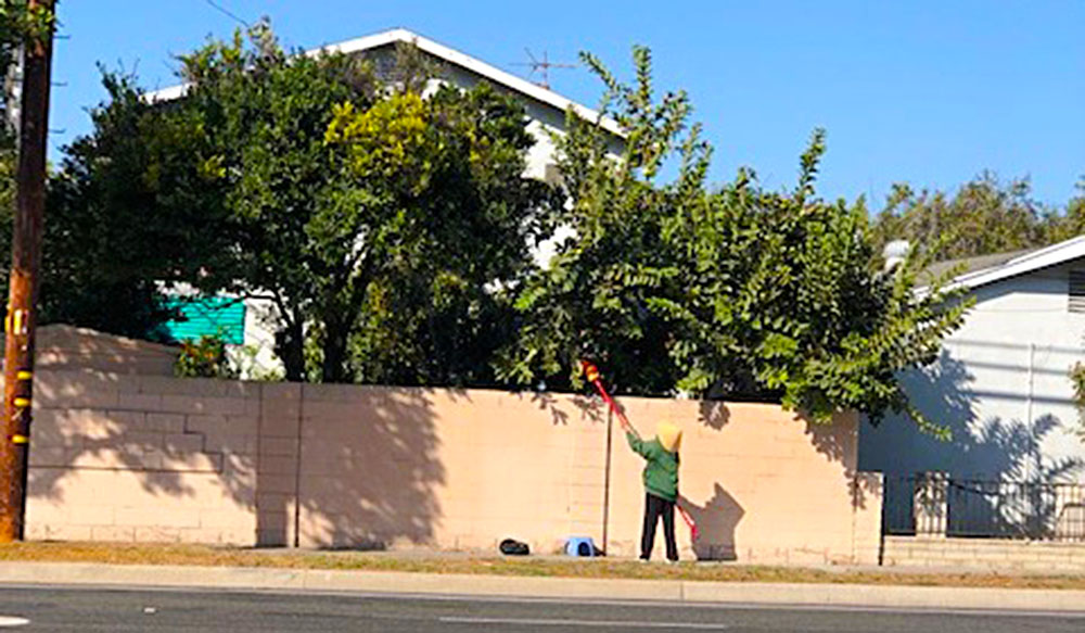 Một bà Việt Nam đang hái trộm ổi trên đường McFadden gần ngã tư Euclid. (Thanh Phong)