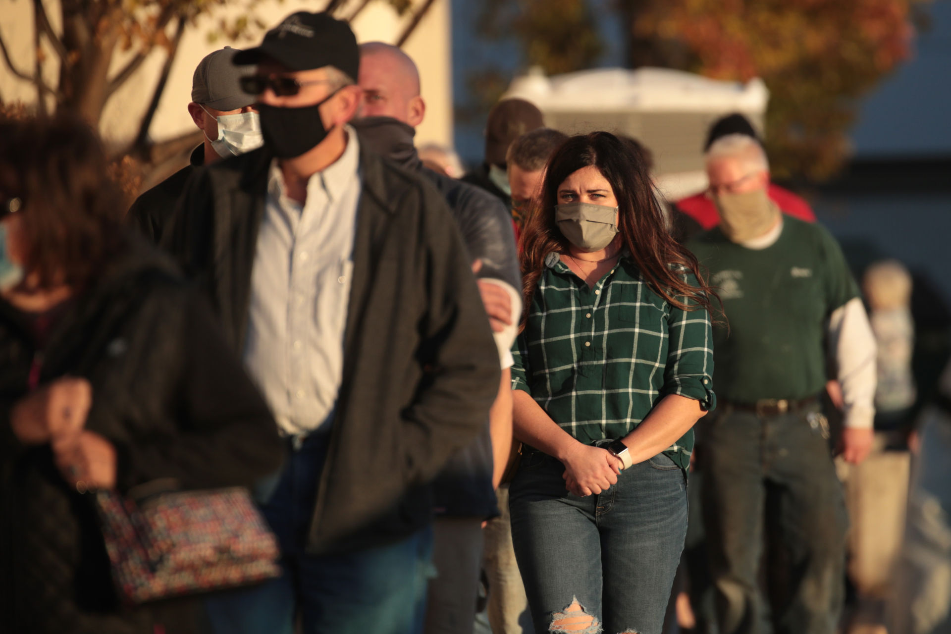 Cử tri xếp hàng chờ bỏ phiếu ở Janesville, Wisconsin, hôm 3 Tháng Mười Một. (Hình: Scott Olson/Getty Images)