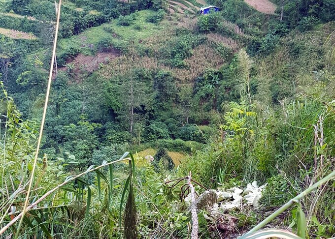 Xe Uaz nằm nghiên ở vách núi tại hiện trường. Ảnh: Cục Cảnh sát giao thông