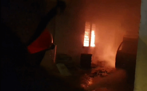 Theo đó, bảo vệ xưởng sản xuất nghe thấy 2 tiếng nổ lớn nên chạy thoát ra ngoài. Ngọn lửa sau đó bốc cháy ngùn ngụt bao trùm toàn bộ ngôi nhà 2 tầng này và có nguy cơ cháy lan sang các gia đình xung quanh.