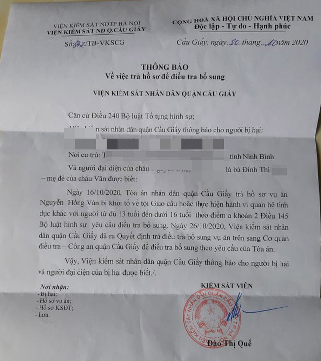Ngày 11/11, trao đổi với chúng tôi, chị Đinh Thị Mai (xin phép được thay đổi tên, quê ở Ninh Bình) cho biết, gia đình chị đã nhận được thông tin phía TAND quận Cầu Giấy (Hà Nộ) về việc trả hồ sơ cho cơ quan CSĐT Công an quận điều tra bổ sung vụ án "Giao cấu hoặc thực hiện hành vi quan hệ tình dục khác với người dưới 16 tuổi".