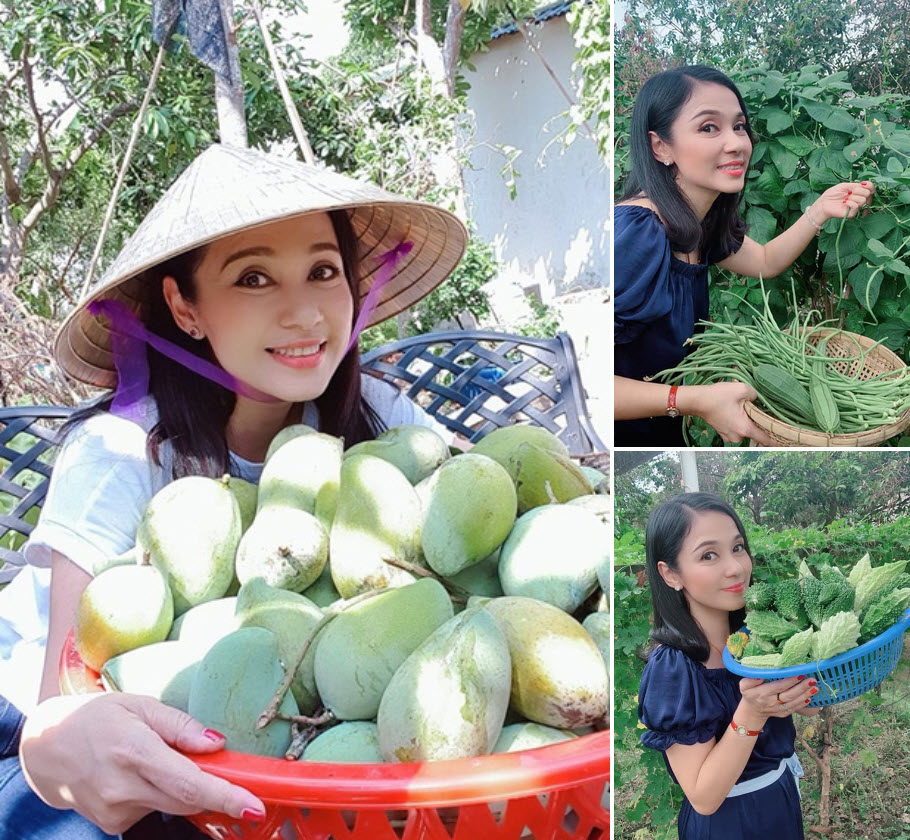 "Người đẹp Tây Đô" Việt Trinh có trồng rau sạch như mồng tơi, mướp đắng, bầu bí...trong khu vườn nhà của nữ diễn viên Việt Trinh, khiến nhà vườn rộng 2500m2 ngập tràn có rất nhiều cây ăn quả như: xoài, khế, ổi, cóc, đu đủ...