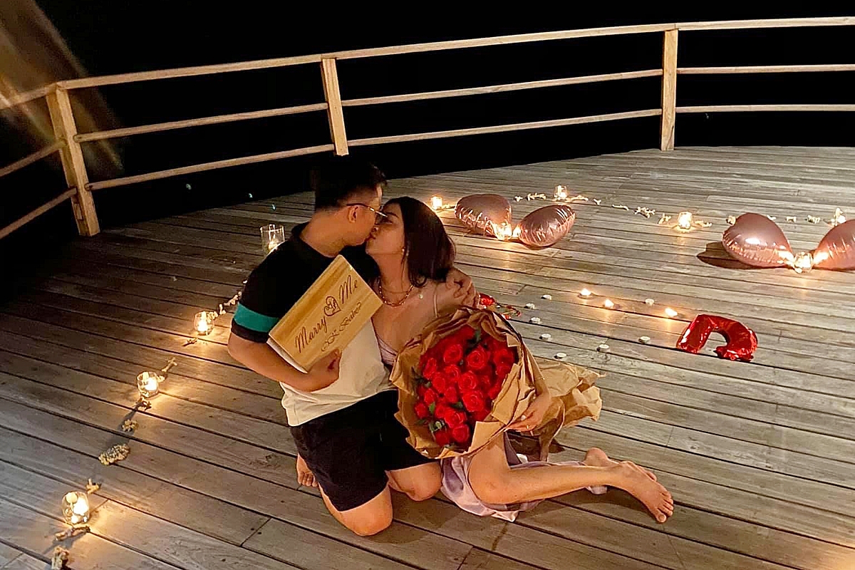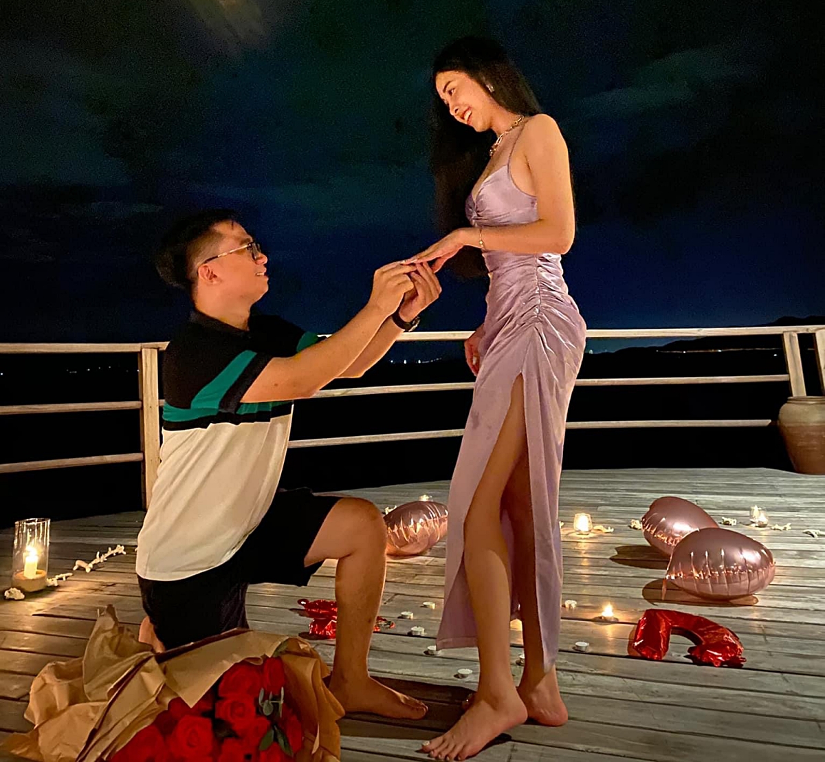 Buổi cầu hôn diễn ra ở không gian biển lãng mạn. 'Một nửa' của á hậu Thúy An chuẩn bị hoa, nến và quỳ gối trao nhẫn cho cô. 'Ngày hôm nay là tất cả những gì anh cố gắng trong ba năm qua', chàng trai bày tỏ. Đáp lại, á hậu cám ơn bạn trai luôn bên cạnh, trở thành một người bạn, người anh và sắp tới là chồng của cô.