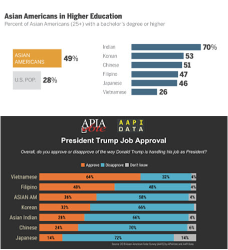 Những người Mỹ da trắng ủng hộ Donald Trump cuồng nhiệt đều là thành phần ít học, nuối tiếc quá khứ và cảm thấy bị xã hội bỏ rơi. Theo một tổng kết tại Mỹ năm 2018 thì người Việt Nam không học giỏi như chúng ta tưởng. Chỉ có 26% người Việt tại Mỹ tốt nghiệp đại học, thấp nhất trong các nước châu Á. Philippines là 47% và đứng đầu là Ấn Độ với 70%. Tỉ lệ đó trái ngược hoàn toàn với sự ủng hộ dành cho Donald Trump. Việt Nam đứng đầu bảng với 64% trong khi quốc gia đồng minh thân thiết của Mỹ là Nhật thì chỉ có 14% ủng hộ Donald Trump và Hàn Quốc là 32%.