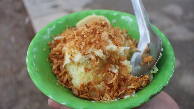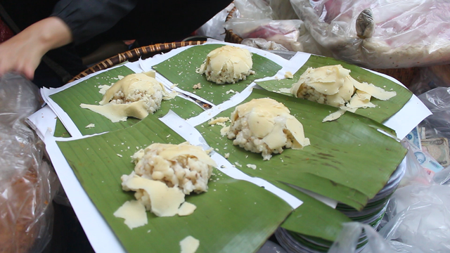 Hoặc bọc trong lá chuối, tùy vào việc ăn khách tại chỗ hay mang về, đậu xanh được cắt thành từng lát, rắc hành phi vàng, cuối cùng là thêm ruốc hoặc chả.