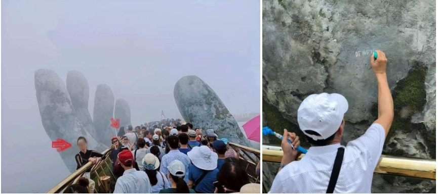 Cùng thời điểm trên, một nam du khách còn dùng bút xóa ghi vài ký tự lên bệ đá tại cầu Vàng sau đó dùng điện thoại chụp ảnh tự sướng, ghi lại "chiến tích". Đại diện một khu nghỉ dưỡng tại Bà Nà Hills thông tin trên fanpage rằng đội họa sĩ của Bà Nà đã mất hơn 4 tiếng để sơn sửa, khắc phục sự cố này.