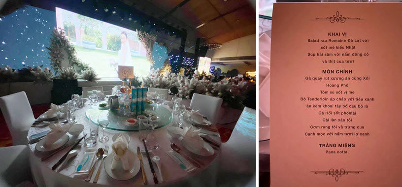 Không gian tiệc cưới của á hậu được trang trí với tông màu trắng lãng mạn. Thực đơn buổi tiệc đa dạng với các món Á - Âu kết hợp. Món chính gồm gà quay rút xương, tôm sú sốt vị me, bò áp chảo, cá hồi sốt phô mai, cơm rang tỏi và trứng cua...