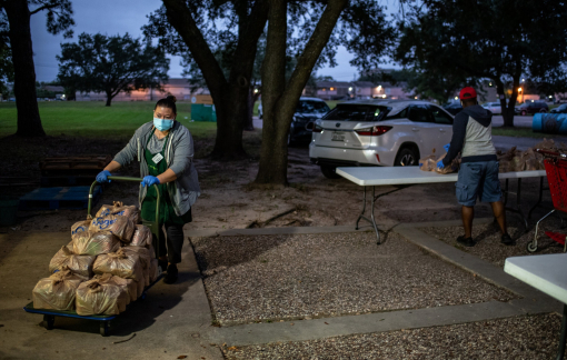 Các tình nguyện viên chuẩn bị trước giờ phát thực phẩm tại một địa điểm từ thiện ở Houston, bang Texas