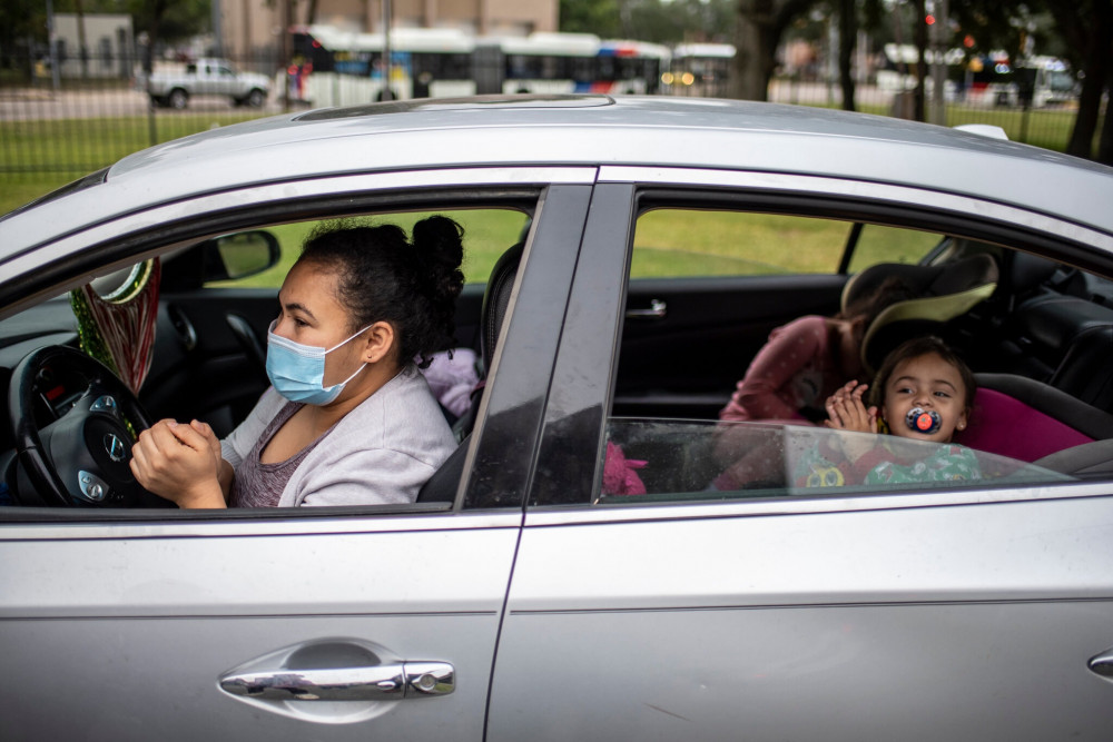 Dani chở các con đến xếp hàng tại nơi nhận thức ăn từ thiện ở Houston
