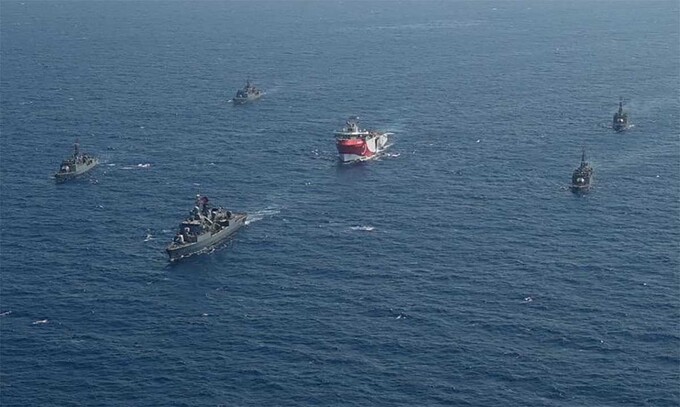 Tàu khoan Oruc Reis (giữa) và nhóm chiến hạm hộ tống ở khu vực phía đông Địa Trung Hải, ngày 12/8. Ảnh: Bộ Quốc phòng Thổ Nhĩ Kỳ.